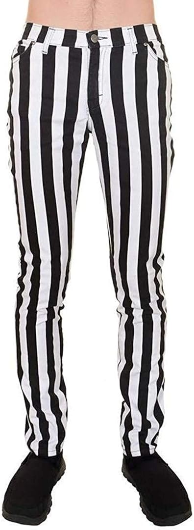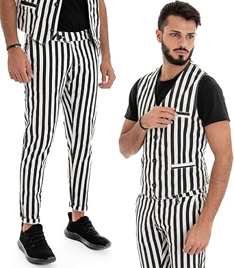 Pantalon Rayé Noir Et Blanc Homme: Il est associé à un pantalon noir uni avec une taille et des chevilles élastiques.